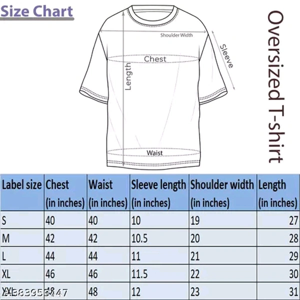 Cotton Blend Oversize T-shirt, Pack of 1Name: Cotton Blend Oversize T-shirt, Pack of 1Fabric: Cotton BlendSleeve Length: Short SleevesPattern: PrintedNet Quantity (N): 1Sizes:S (Chest Size: 40 in, Length Size: 27 in) M (Chest Size: 42 in, Length Size: 28 in) L (Chest Size: 44 in, Length Size: 29 in) XL (Chest Size: 46 in, Length Size: 30 in) Printed T-shirt for Men Half sleeves. Ov