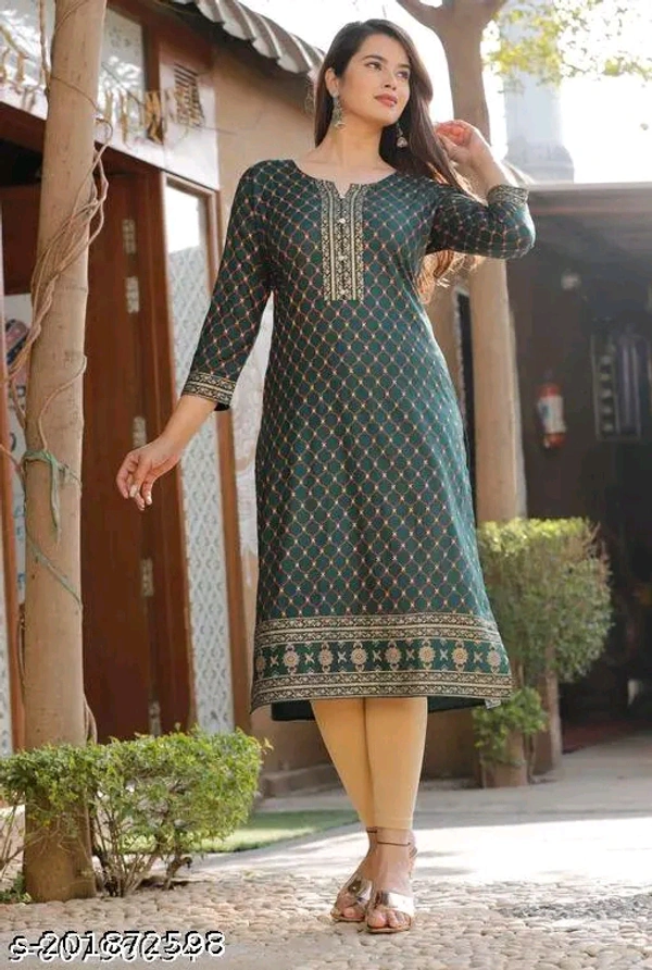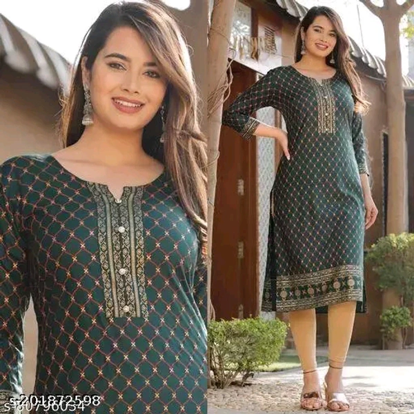 Straight KurtiName: Straight KurtiFabric: RayonSleeve Length: Three-Quarter SleevesPattern: PrintedCombo of: SingleSizes:S (Bust Size: 36 in, Size Length: 46 in) M (Bust Size: 38 in, Size Length: 46 in) L (Bust Size: 40 in, Size Length: 46 in) XL (Bust Size: 42 in, Size Length: 46 in) XXL (Bust Size: 44 in, Size Length: 46 in) XXXL (Bust Size: 46 in, Size Length: 46 in) Printed Str